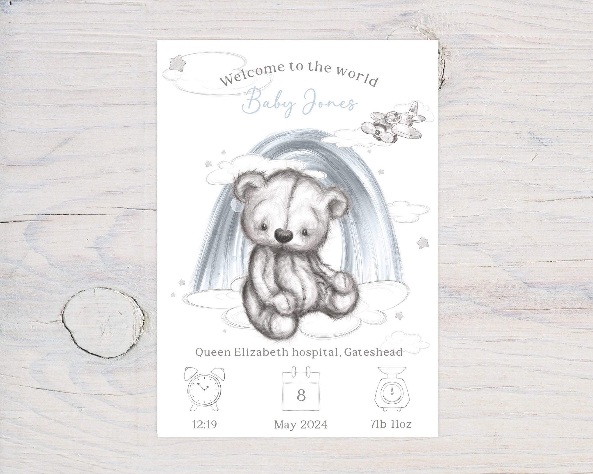 Personalised Baby Birth Art: Teddy Bear Nursery Decor, Pink or Blue, Gift