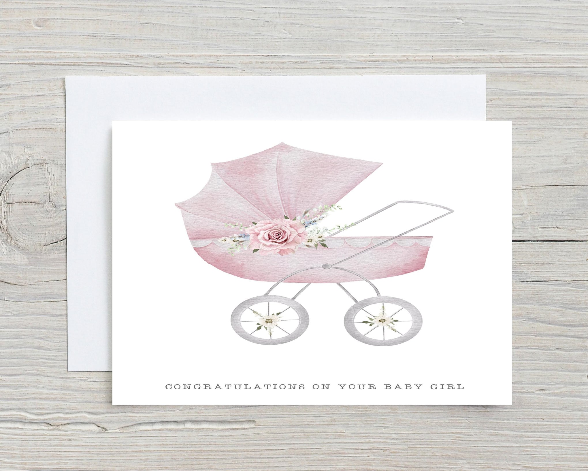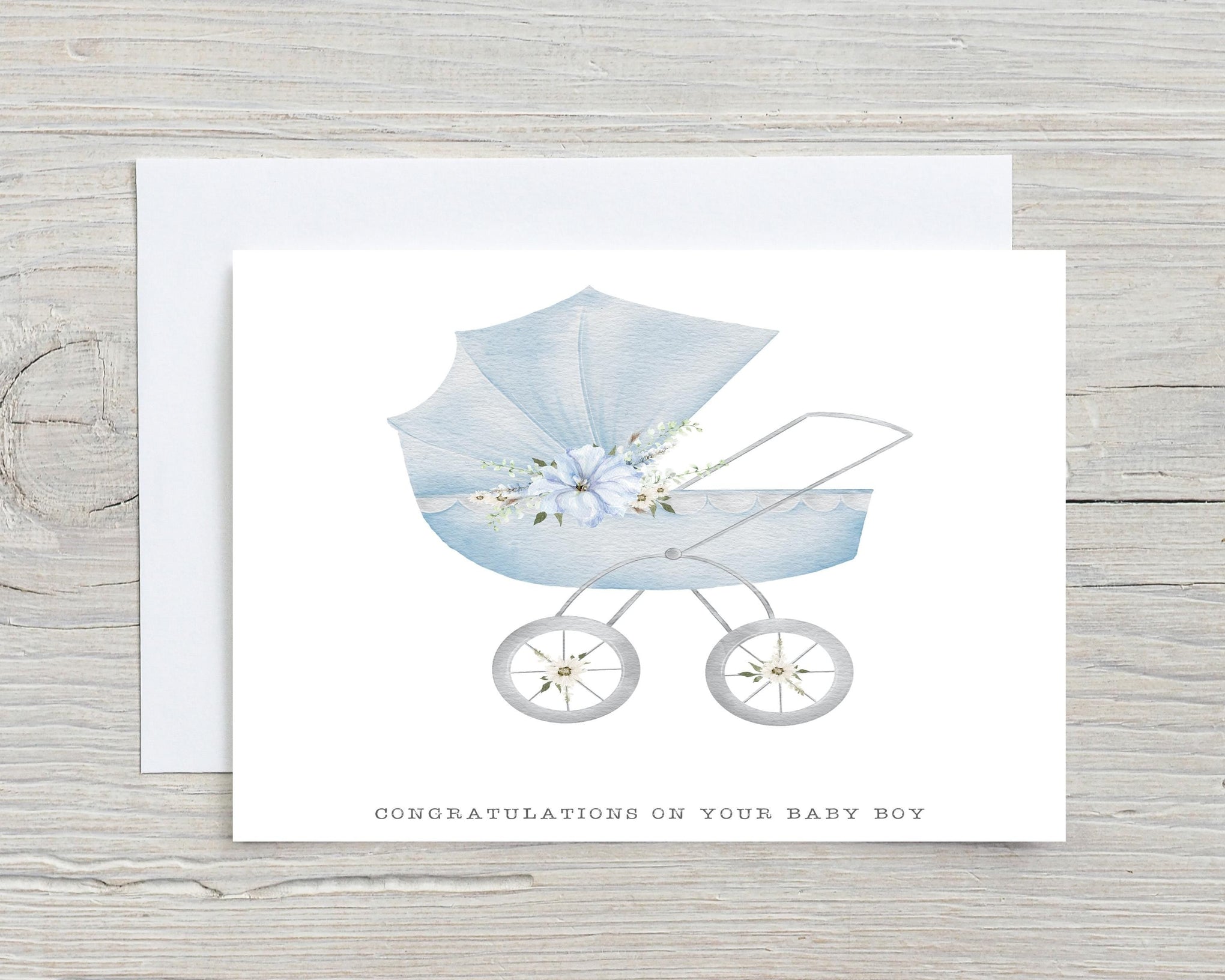 Here's our beautiful New Baby Pram Greetings Card, designed to show off all the details of the new Baby! Ideal gift for yourselves, or for family, friends, colleagues - this is a personal, meaningful gift, that will be appreciated and kept as a keepsake. Choose from a Pink or Blue Design. At the bottom of the design(s) is says CONGRATULATIONS ON YOUR BABY BOY or CONGRATULATIONS ON YOUR BABY GIRL.