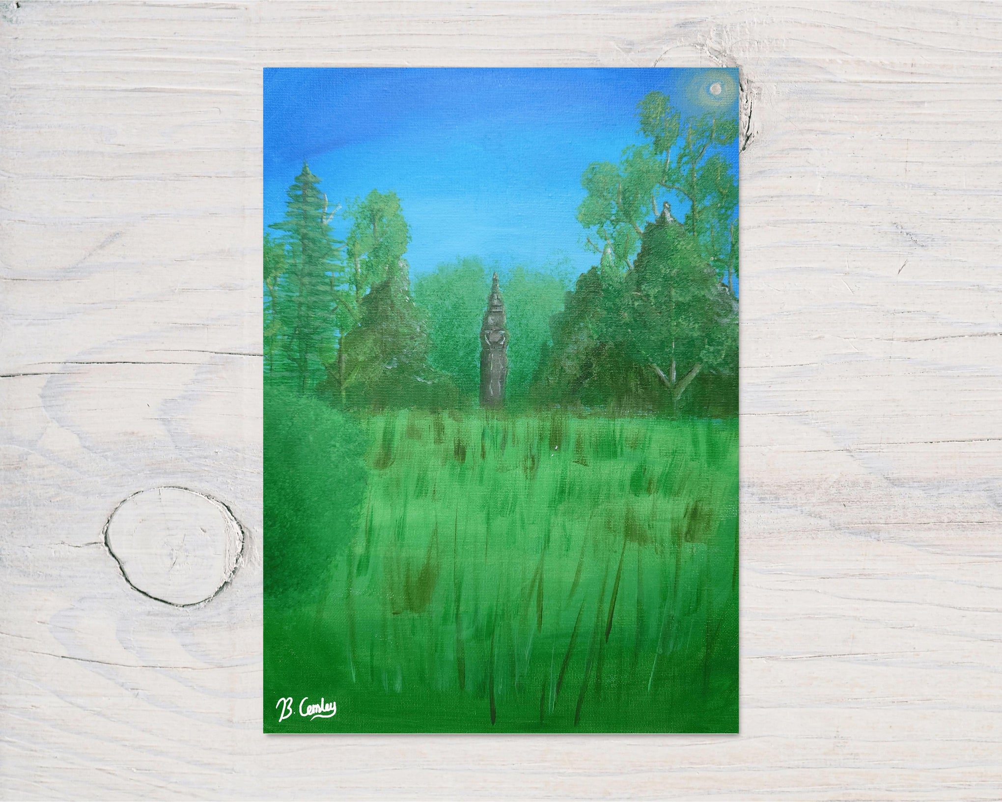 Printed onto an A4 260gsm glossy art card, this Greetings Card vividly portrays the lush greenery and open skies of Albert Park, a beautiful green space close to the artist's home. The artist's skillful use of deep, rich greens and a clear blue sky creates a refreshing and inviting atmosphere. The painting features the park's iconic elements, inviting viewers to stroll through its peaceful grounds. Every brushstroke contributes to the painting's lively character and natural allure, making it a truly special piece for anyone who appreciates local art or has a connection to Abingdon.