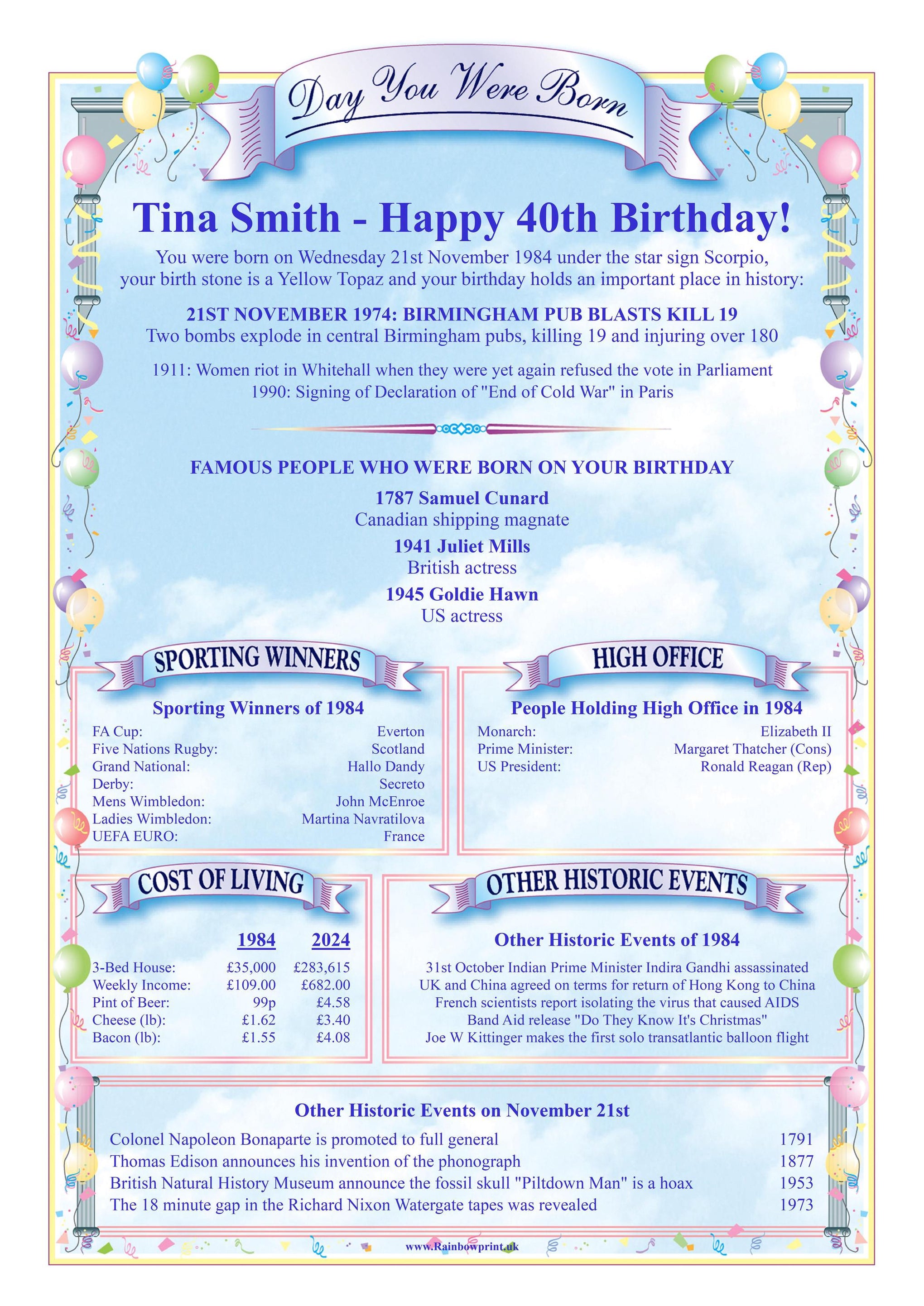 ✨ Personalised Details: Customised with the name and birthdate for a truly personal touch. ✨ Historical Insights: Discover significant events, news headlines, and interesting facts from the day they were born.