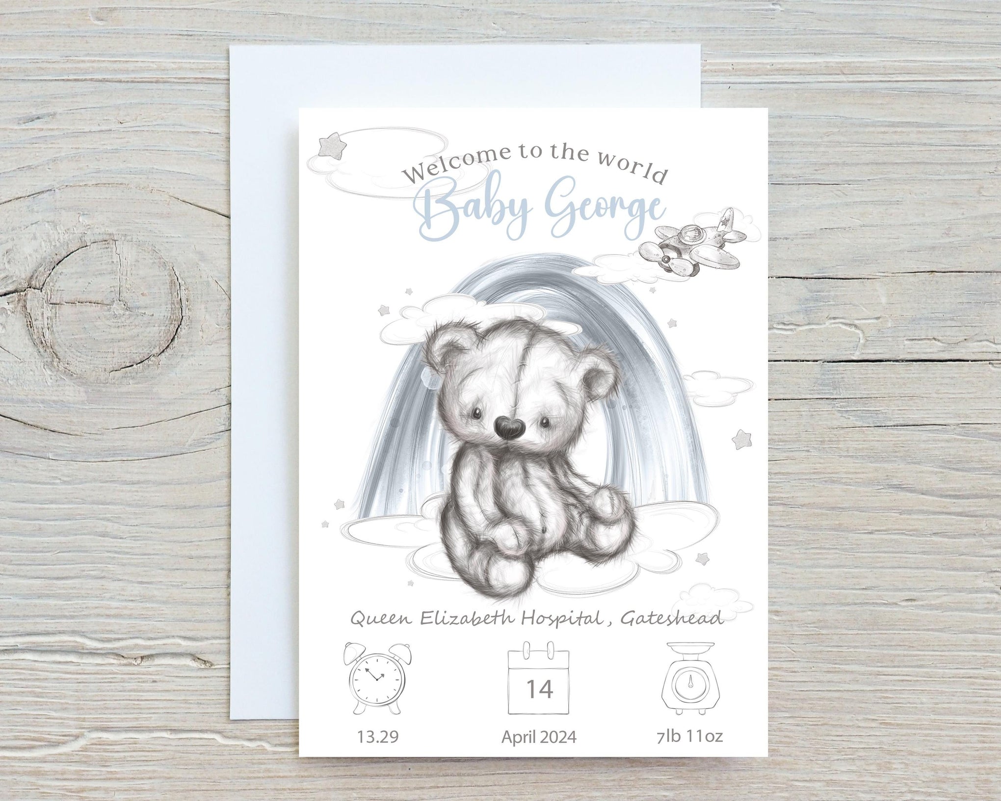 All we need are a few details, the name you'd like on the Greetings Card (whether Baby Jones, Baby Adam, Baby Emma, etc), the date of birth, the time of birth, and the weight of the beautiful baby, and if required, the name of the hospital the baby was born at, or the town/city.